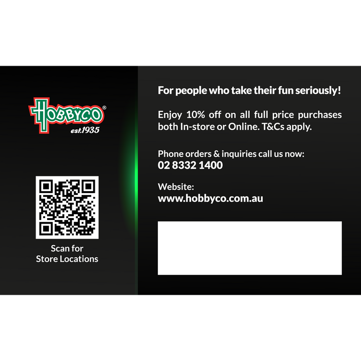Join our Hobbyco Club Membership today to enjoy 10% off all full price purchases (in-store or Online).